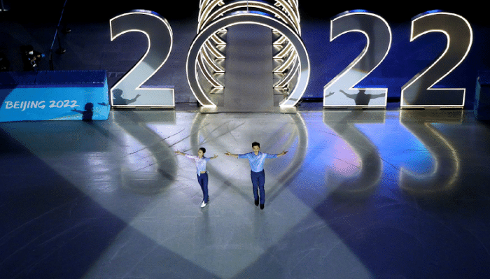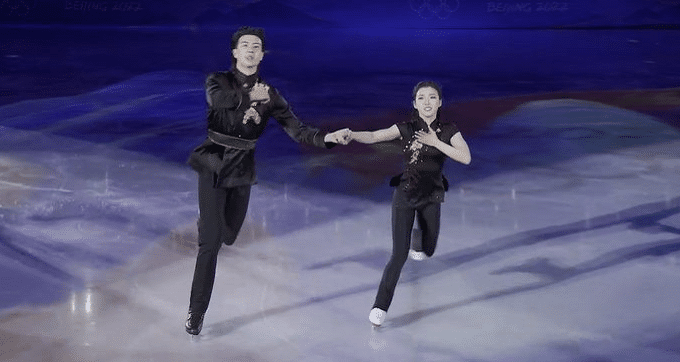 第4个登场的是彭程和金杨组合,他们在昨天结束的双人滑中,排名第5,无缘领奖台。这次带来的是表演曲目是李健的《异乡人》,其中陈露还在隔空喊话李健,称看到了自己的歌曲在冬奥会表演滑中奏响了吗。