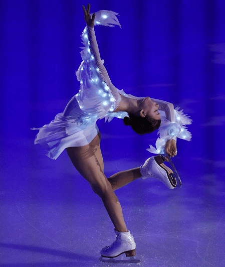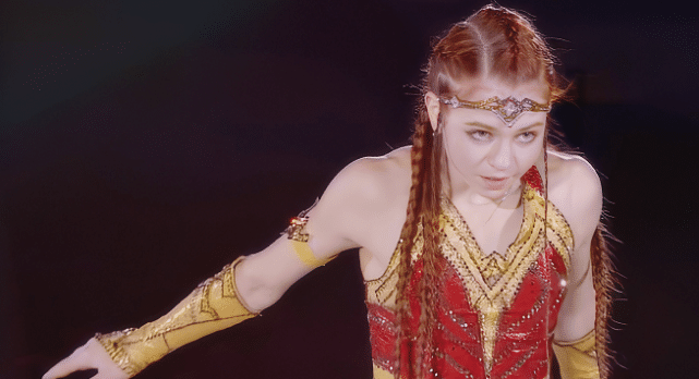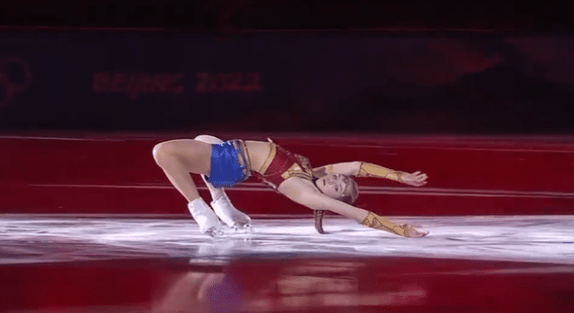 第10个出场的是俄奥队的“莎莎”特鲁索娃,选取的音乐是神奇女侠的角色曲,她穿了一件黑大衣,莎莎把大衣脱了,化身神奇女侠,再度上演经典的蟹步,手拿周跳也相当轻松,整体表演很精彩。