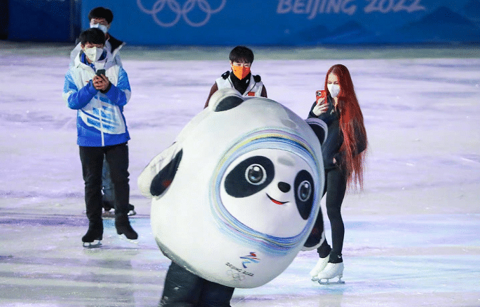 最后是所有选手返场表演,进行答谢,视觉盛宴来袭。冰墩墩压轴登场,确实很可爱。