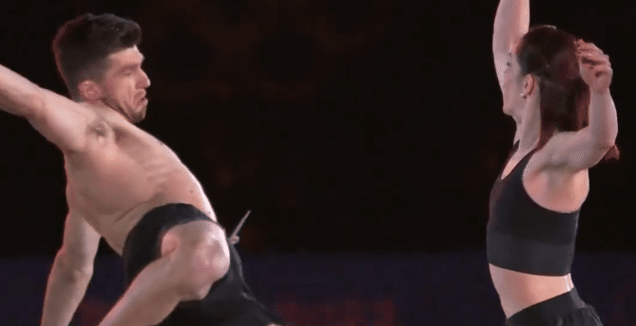 第23个登场的是俄奥双人滑组合米希娜和加利亚莫夫,本届双人滑的铜牌获得者,也有变装,两人配合的相当好。