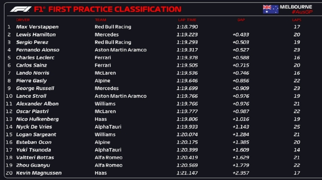 24直播网讯 北京时间03月31日,2023年F1澳大利亚大奖赛第1次练习赛在墨尔本赛道结束,红牛车队维斯塔潘凭借1:18.790的成绩取得头名,梅赛德斯车队汉密尔顿落后0.433秒第二,另一位红牛车手佩雷兹第三,他的最快圈是用中性胎做出的。