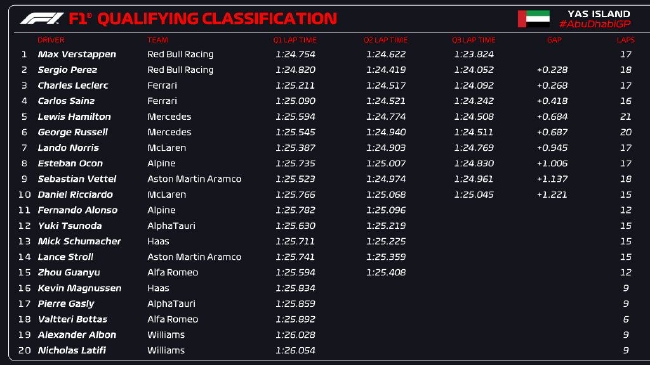 2022年F1阿布扎比大奖赛排位赛成绩表: