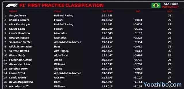 2022F1巴西大奖赛第一次练习赛比赛时间成绩表: