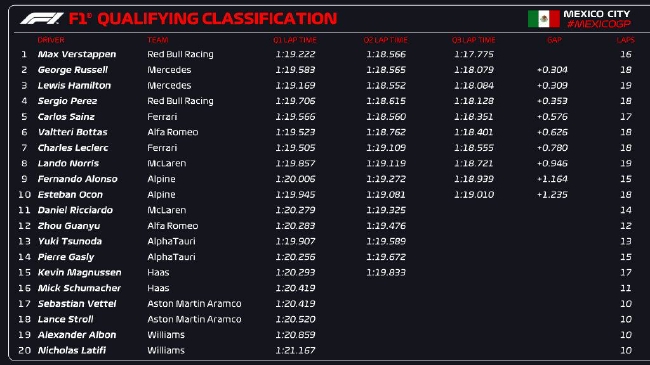2022年F1墨西哥大奖赛第3练习赛成绩表: