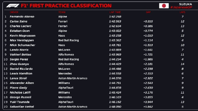 2022年F1日本大奖赛第1次练习赛成绩表: