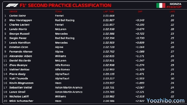 24直播网讯 2022年F1意大利大奖赛第2次练习赛在蒙扎赛道结束,法拉利车队塞恩斯1分21秒664圈速最快,红牛车队维斯塔潘第二,另一位法拉利车手勒克莱尔第三。中国车手周冠宇第12位。