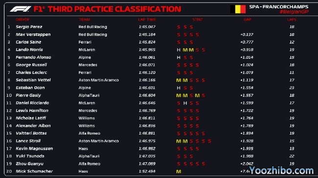 2022年F1比利时大奖赛第3次练习赛成绩表: