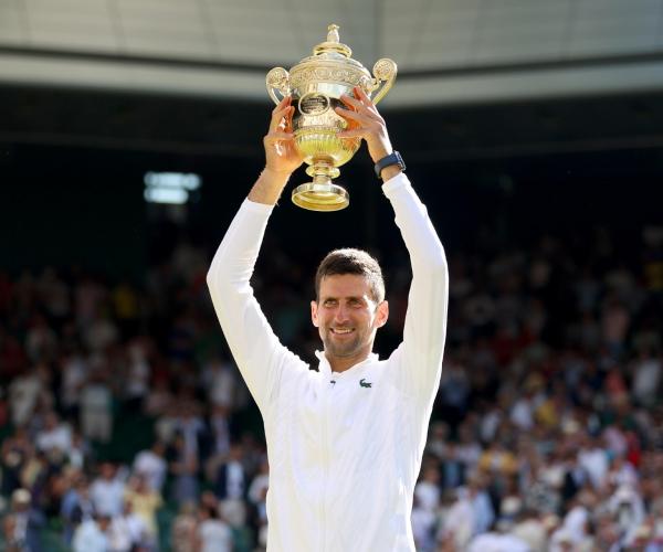 24直播网讯 7月10日讯 2022年第三项大满贯赛事温布尔登网球公开赛,在全英草地俱乐部进入到最后一个比赛日的争夺。万众瞩目的男单决赛当中,头号种子、温网6冠王德约科维奇4-6、6-3、6-4、7-6(3)逆转尼克-克耶高斯,职业生涯首次击败对手的同时,携温网男单28连胜实现了温网四连冠,这也是德约科维奇职业生涯的第21个大满贯男单冠军,他也成为了历史上第一位在两个不同大满贯都拿到7个及以上冠军的球员,温网7冠的成绩也追平了威廉-伦肖和皮特-桑普拉斯。全场比赛耗时3小时04分。