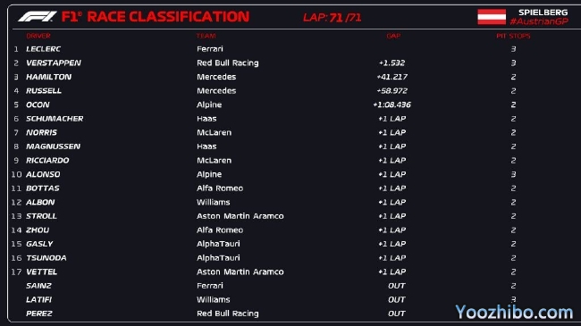 24直播网讯 北京时间07月10日,2022年F1奥地利大奖赛正式比赛在红牛环赛道结束,法拉利车队勒克莱尔顶住红牛车队维斯塔潘最后时刻的追击,时隔七场比赛再次站上最高领奖台!这也是他生涯首次从非杆位发车拿到冠军!维斯塔潘亚军,梅赛德斯车队汉密尔顿季军。