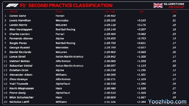 24直播网讯 2022年F1英国大奖赛第2次练习赛在银石赛道结束,法拉利车队塞恩斯以1:28.942排名第一,梅赛德斯车队汉密尔顿落后0.163秒排名第二,迈凯伦车队诺里斯落后0.176秒排名第三,维斯塔潘和勒克莱尔分列第四和第五。排名六至十位的车手分别是阿隆索、佩雷兹、拉塞尔、里卡多、斯托尔。周冠宇的最快圈速排名第15位。