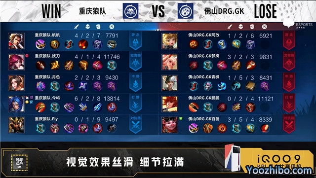 重庆狼队选用:关羽、橘右京、不知火舞、伽罗、张飞