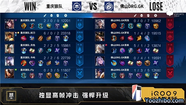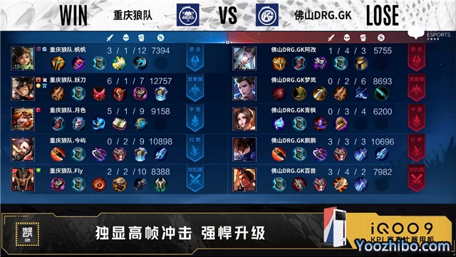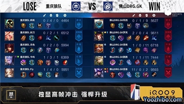 开局佛山DRG.GK边路换线。2分57秒野区团战佛山DRG.GK打出0换2。3分02秒重庆狼队对抗路击杀马可波罗。5分13秒佛山DRG.GK拿下暴君。8分07秒野区团战重庆狼队击杀项羽。8分36秒重庆狼队中路击杀马可波罗。9分25秒佛山DRG.GK中路击杀嬴政。9分45秒佛山DRG.GK野区击杀镜。11分42秒佛山DRG.GK拿下暗影主宰。12分55秒佛山DRG.GK发育路击杀夏侯惇。13分18秒佛山DRG.GK摧毁敌方发育路高地塔。14分31秒佛山DRG.GK拿下暗影暴君。16分02秒中路双方1换1,佛山DRG.GK拿下暗影主宰。17分38秒重庆狼队野区打出0换2。18分25秒重庆狼队拿下暗影暴君。21分39秒佛山DRG.GK击杀夏侯惇并拿下风暴龙王。23分13秒重庆狼队对抗路击杀露娜。25分02秒重庆狼队拿下风暴龙王。26分34秒重庆狼队摧毁敌方对抗路高地塔。27分42秒重庆狼队野区击杀露娜。28分18秒重庆狼队拿下风暴龙王。28分57秒重庆狼队高地前击杀露娜。29分18秒高地团战重庆狼队打出0换3。29分33秒重庆狼队摧毁敌方水晶拿下比赛。