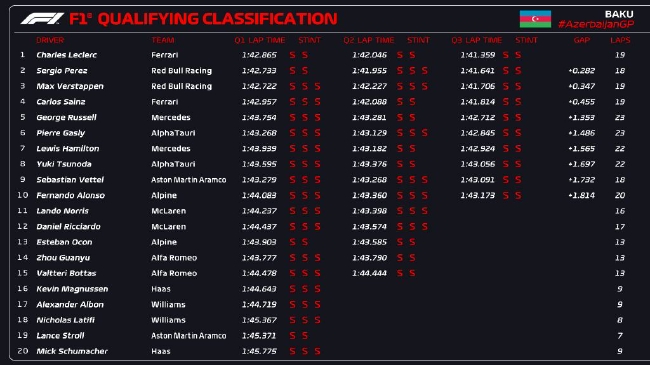 塞恩斯、拉塞尔、加斯利、汉密尔顿、角田裕毅、维特尔、阿隆索分列四至十位。中国车手周冠宇第14位,他的队友博塔斯第15位。