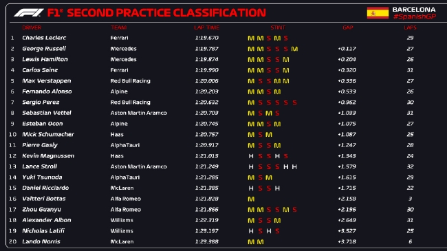 24直播网讯 2022年F1西班牙大奖赛第2次练习赛5月20日晚上结束,法拉利车队勒克莱尔以1:19.670的成绩获得二练头名,两位梅赛德斯车手拉塞尔、汉密尔顿名列二三位。塞恩斯第四,维斯塔潘第五,第六至第十位的车手是阿隆索、佩雷兹、维特尔、奥康和米克·舒马赫。