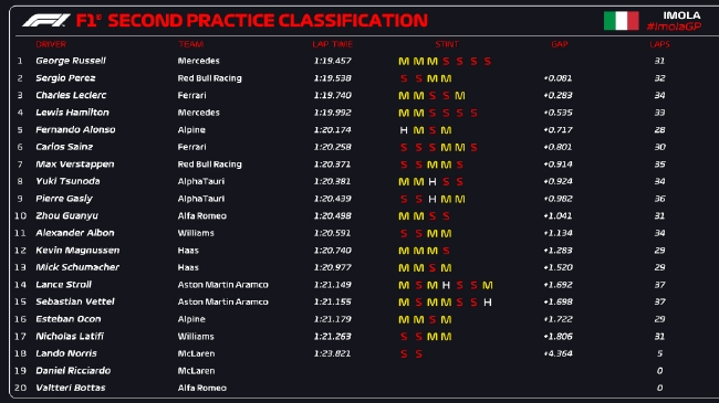 24直播网讯 2022年F1伊莫拉站第2次练习赛4月23日晚结束,车手们都在进行长距离测试,最终拉塞尔凭借1:19.457的单圈成绩位列第一,佩雷兹落后0.081秒位列第二,勒克莱尔第三。第四至第十分别是:汉密尔顿、阿隆索、塞恩斯、维斯塔潘、角田裕毅、加斯利、周冠宇。