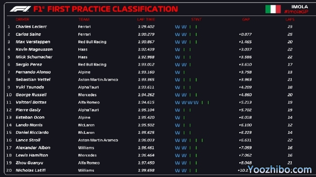 24直播网讯 2022年F1伊莫拉站第1次练习赛4月22日晚结束,法拉利车队勒克莱尔使用半雨胎跑出1:29.402排名第一,他的队友塞恩斯落后0.877秒排名第二,红牛车队维斯塔潘落后1.465秒排名第三,马格努森第四,米克·舒马赫第五。排名六至十位的车手分别是佩雷兹、阿隆索、维特尔、角田裕毅、拉塞尔。