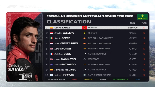 24直播网讯 :北京时间4月8日下午,2022年F1澳大利亚大奖赛第1次练习赛在墨尔本赛道结束。前四名被法拉利和红牛包揽:塞恩斯1:19.806位列第一,队友勒克莱尔落后0.571秒排名第二;佩雷兹和维斯塔潘分列三四,前四名车手差距在1秒之内。