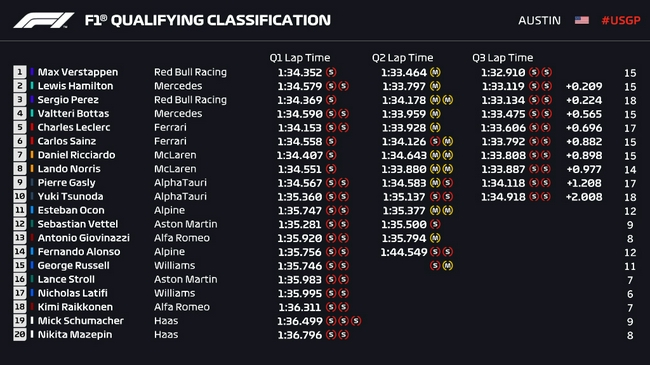 最后一搏,赛道部分区域有细雨落下。博塔斯的出场位置跑在了汉密尔顿的前面,汉密尔顿凭借第二计时段的刷紫表现一度占据首位,但维斯塔潘第一计时段再次刷紫。最终,维斯塔潘以1分32秒910的最快单圈锁定个人本赛季第9个,也是职业生涯的第12个杆位,汉密尔顿落后0.209秒列次席,佩雷兹排名第三。