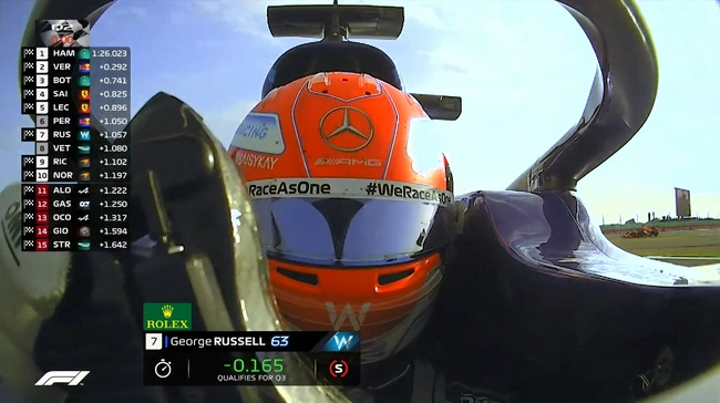 Q3开始后,拉塞尔迟迟没有出站。Q3还剩5分钟时,汉密尔顿以1分26秒134暂列第一,维斯塔潘落后0.172秒暂列第二。Q3还剩不到4分钟时,拉塞尔才刚开始自己的第一个飞驰圈,而这圈也让他暂时排名第七。压哨的最后一个飞驰圈,汉密尔顿没能刷新最快成绩,但维斯塔潘虽然刷新个人成绩,但仍落后汉密尔顿0.075秒没能超越。博塔斯同样刷新个人成绩,但未能超越前两人排名第三。勒克莱尔刷新个人成绩,升至第四,塞恩斯刷新个人成绩,但仍排名第九,只在最后关头跑了一个飞驰圈的维特尔排名第十。