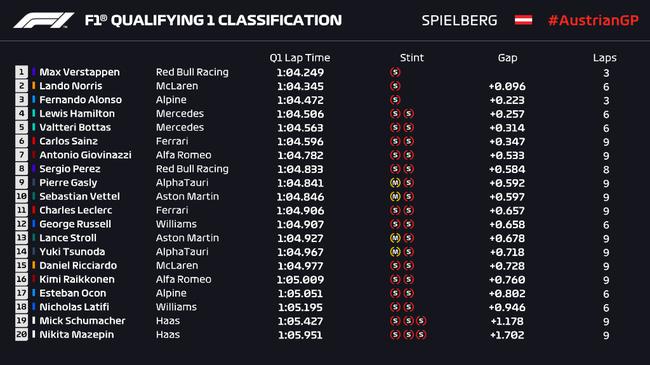 2021F1奥地利大奖赛排位赛Q1最终成绩: