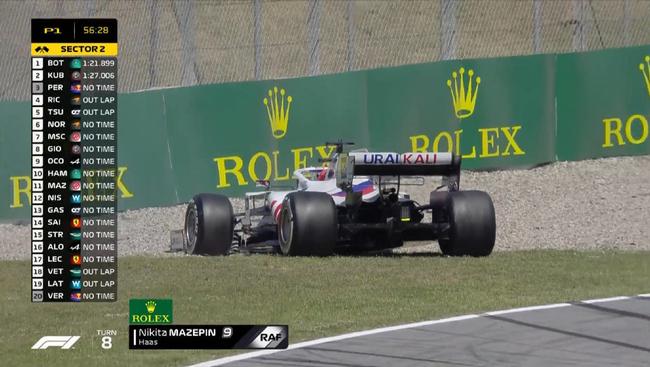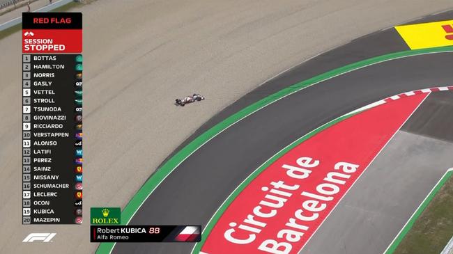 加泰罗尼亚赛道也是一条危险系数很高的赛道。一练刚开始3分半钟,马泽平就在8号弯出弯处滑入了砂石地,引发第2赛段黄旗,不过他随即就将赛车倒回到赛道上,练习赛继续进行。40分钟后,库比卡在10号弯打滑陷入砂石地,引发红旗。