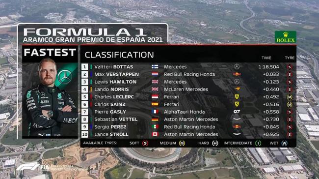 2021F1西班牙大奖赛一练成绩: