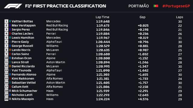 24直播网讯 北京时间4月30日晚,2021F1大奖赛葡萄牙站一练战罢。经过一个小时的争夺,梅奔车手博塔斯做出1分19秒648的全场最快单圈,排名第一;红牛车手维斯塔潘落后0.025秒排名第二,佩雷兹排名第三。P4-P10分别为:勒克莱尔、汉密尔顿、加斯利、拉塞尔、诺里斯、塞恩斯和奥康。