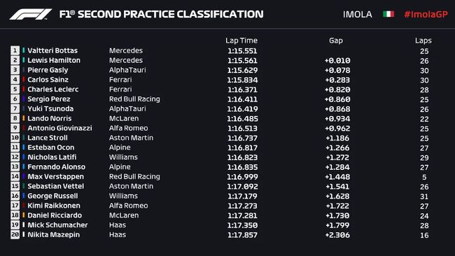 24直播网讯 北京时间4月16日晚,2021赛季F1大奖赛伊莫拉站结束了第二次自由练习赛。由于法拉利车手勒克莱尔在二练结束不久前的撞车,二练直接宣告了结束。最终,梅奔车手博塔斯使用中性胎跑出1分15秒551,依旧排名第一;他的队友汉密尔顿落后0.01秒排名第二,加斯利排名第三。