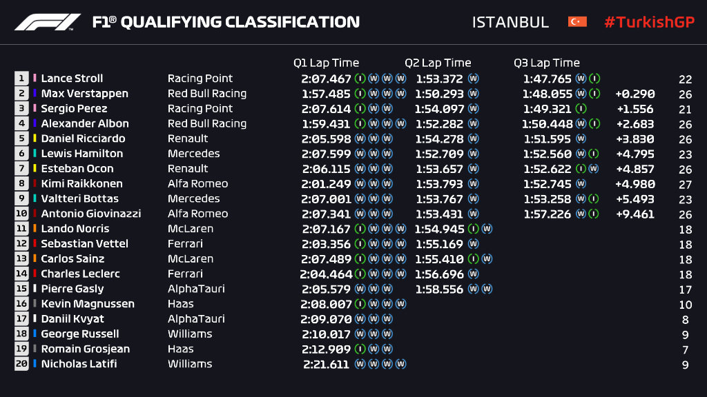 北京时间11月14日,2020赛季F1世界锦标赛土耳其大奖赛排位赛在伊斯坦布尔公园赛道落下帷幕。周六的第三次自由练习赛迎来了较大的降雨,所有车手都显得有些无所适从。雨势到了排位赛略微减小,但是赛道表面的抓地力还是非常糟糕,排位赛由此在极度潮湿的状态下开始,多数车手都发生了打滑的情况。最终,兰斯-斯托尔(Lance Stroll)代表赛点车队时隔十一年破天荒地拿下了杆位,这是加拿大人职业生涯的首个杆位。此前一直被看好的马克思-维斯塔潘(Max Verstappen)最后关头没有能够提升成绩,和队友亚历山大-阿尔本(Alexander Albon)分获第二和第四的发车位。