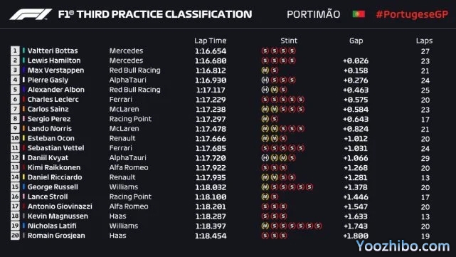 24直播网讯:北京时间10月24日晚,2020年F1葡萄牙大奖赛第三节自由练习赛结束,奔驰车手瓦尔特利·博塔斯以1分16秒654的成绩继续拿下全场第一,芬兰人包揽了所有三节自由练习赛的榜首位置。