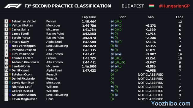 24直播网讯 北京时间07月17日21点,2020赛季的F1匈牙利站第二次练习赛,雨中湿滑的赛道上所有车手使用湿地轮胎,法拉利车手维特尔最快,梅赛德斯车手博塔斯第二,迈凯伦车手塞恩斯第三。汉密尔顿只跑了一个检测圈,没有成绩。