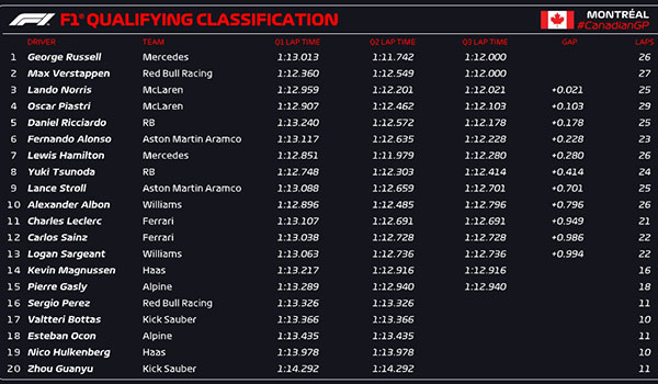 24直播网讯 北京时间06月09日,F1加拿大站排位赛,拉塞尔为梅赛德斯-奔驰拿下本赛季首杆,也是他个人职业生涯的第二次杆位。维斯塔潘在最后一圈做到了和拉塞尔同样的圈速,但因拉塞尔先做出该成绩,维斯塔潘遗憾获得第二名,诺里斯第三。
