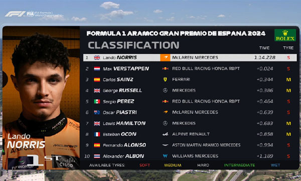 24直播网讯 北京时间06月22日讯 F1西班牙大奖赛排位赛战罢,迈凯伦车手诺里斯以0.02秒优势夺得个人本赛季首个杆位,也是生涯第二个杆位。红牛车手维斯塔潘第二,梅奔车手汉密尔顿第三。索伯车队的中国车手周冠宇本赛季首次进入第二节排位赛,最终排名第15。