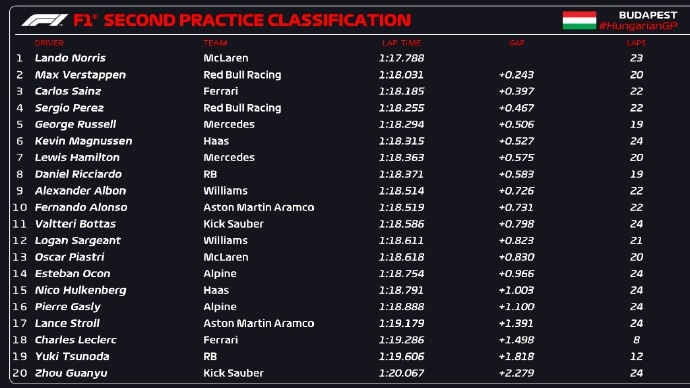 24直播网讯 北京时间7月19日,F1匈牙利站二练结束,诺里斯全场最快,维斯塔潘、赛恩斯位居二、三,勒克莱尔上墙退赛,周冠宇遭佩雷兹阻挡后轮胎损坏,无有效软胎成绩,位居垫底。