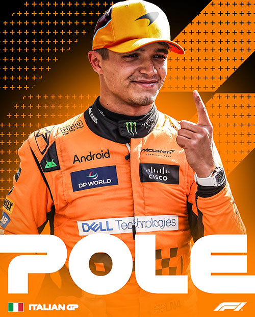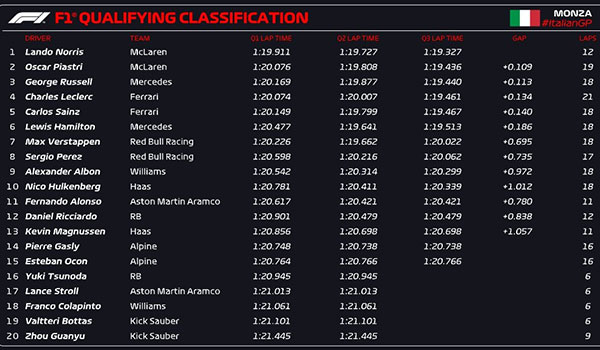24直播网讯 北京时间08月31日,F1意大利大奖赛蒙扎站排位赛,最终诺里斯夺得杆位,迈凯伦双车头排发车,维斯塔潘仅第7,索伯双车垫底,周冠宇第20。