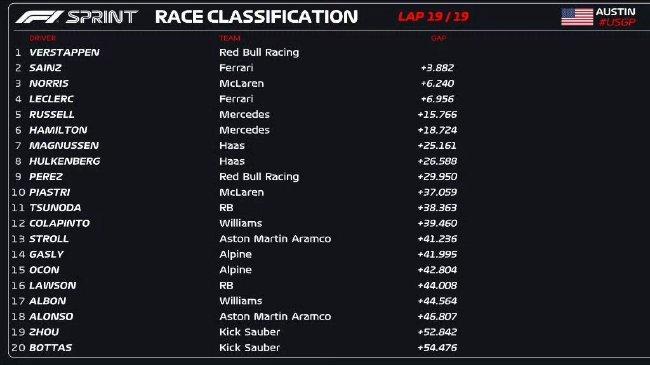 24直播网讯 2024年F1美国大奖赛冲刺赛在奥斯汀赛道结束,红牛车队维斯塔潘收获赛季冲刺赛第4胜,继续扩大积分榜的领先优势。法拉利车队塞恩斯最后一圈超越迈凯伦车队诺里斯获得亚军。诺里斯和另一位法拉利车手勒克莱尔分列第三和第四。