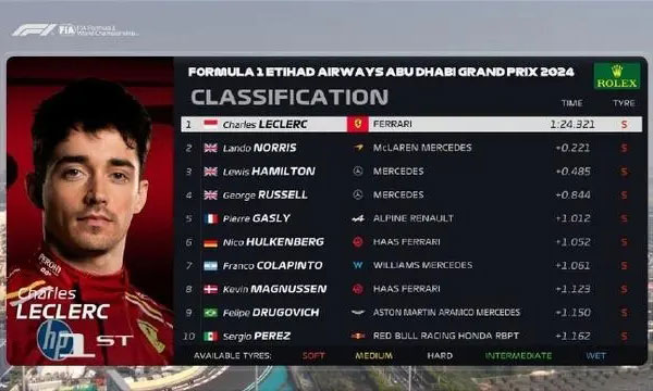 24直播网讯 北京时间12月6日,F1阿布扎比大奖赛结束第一次练习赛争夺,法拉利车手勒克莱尔排名第1,迈凯伦车手诺里斯排名第2,梅奔车手汉密尔顿排名第3。