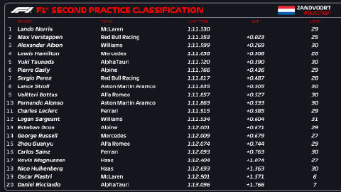 24直播网讯 北京时间08月25日,2023F1荷兰大奖赛第二次练习赛,车手们二练中首先进行了软胎的测试,随后进入了长距离重载油阶段。最终,在单圈成绩方面,诺里斯以1:11.330取得头名,维斯塔潘落后0.023秒屈居第二,驾驶威廉姆斯赛车的阿尔本排名第三!