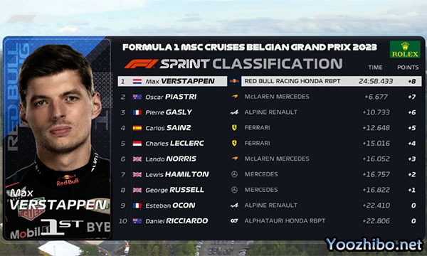 24直播网讯 2023年F1比利时大奖赛冲刺赛在斯帕赛道结束,红牛车队维斯塔潘在安全车结束后完成对皮亚斯特里的超越,顺利拿到冲刺赛第一,迈凯伦车队澳大利亚新秀皮亚斯特里取得第二名,Alpine车队加斯利上升三个位置,取得第三。