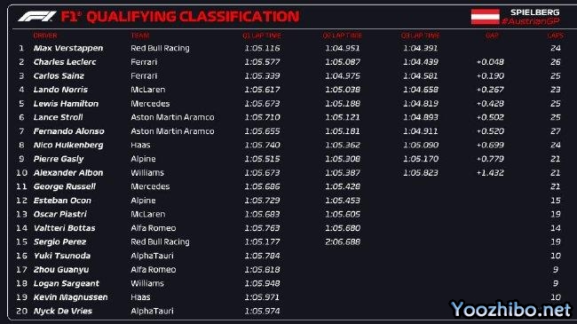 排在第四至第十的分别是:诺里斯、汉密尔顿、斯托尔、阿隆索、霍肯伯格、加斯利、阿尔本。拉塞尔和佩雷兹遗憾未能进入到Q3,周冠宇第17位发车。