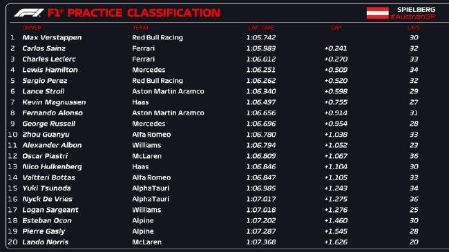 24直播网讯 2023年F1奥地利大奖赛练习赛结束,红牛车队维斯塔潘最后时刻使用中性胎做出1:05.742的成绩,刷到场上头名!法拉利车队塞恩斯和勒克莱尔的软胎成绩排在第二和第三,但与维斯塔潘的单圈差距都在0.2秒以上。