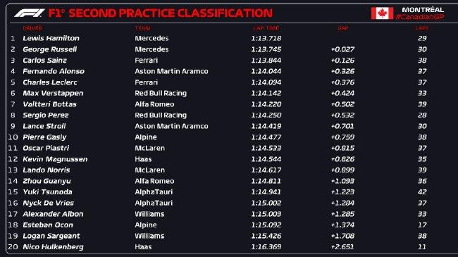 阿隆索和勒克莱尔分列第四和第五。第六至第十位的车手分别是维斯塔潘、博塔斯、佩雷兹、斯托尔和加斯利。