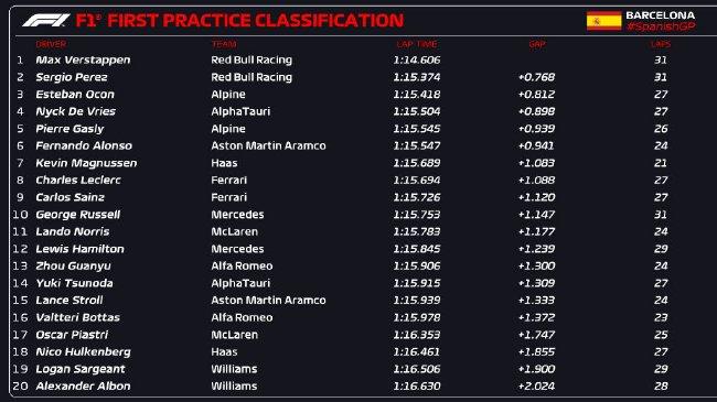 24直播网讯 2023年F1西班牙大奖赛第1次练习赛在巴塞罗那赛道结束,红牛车队维斯塔潘以1:14.606排名第一,他的队友佩雷兹落后0.768秒排名第二,Alpine车队奥康落后0.812秒排名第三。德弗里斯、加斯利、阿隆索,马格努森,勒克莱尔,塞恩斯,拉塞尔分列四至十位。中国车手周冠宇圈速第13位。