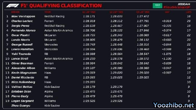 24直播网讯 北京时间03月09日,2024年F1沙特大奖赛排位赛结束,红牛车队维斯塔潘凭借1:27.472的成绩,再次收获杆位;领先第二名勒克莱尔0.319秒,勒克莱尔再次收获头排发车的顺位;佩雷兹位列第三。第四至第十分别是:阿隆索、皮亚斯特里、诺里斯、拉塞尔、汉密尔顿、角田裕毅和斯托尔。