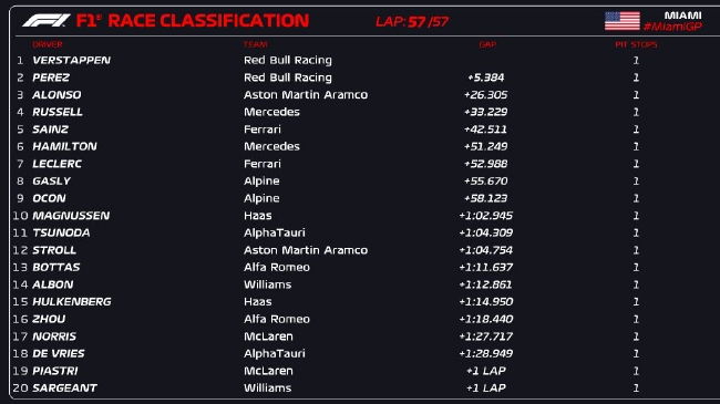 24直播网讯 2023年F1迈阿密大奖赛正式比赛结束,凭借超强的保胎表现,第九位发车的维斯塔潘最终率先冲线,收获本赛季个人的第三个分站冠军,同时他也连续两年在迈阿密大奖赛夺冠!他的队友佩雷兹亚军,红牛车队再次一二带回!阿斯顿马丁车队阿隆索季军,这也是他本赛季第四次登上领奖台。