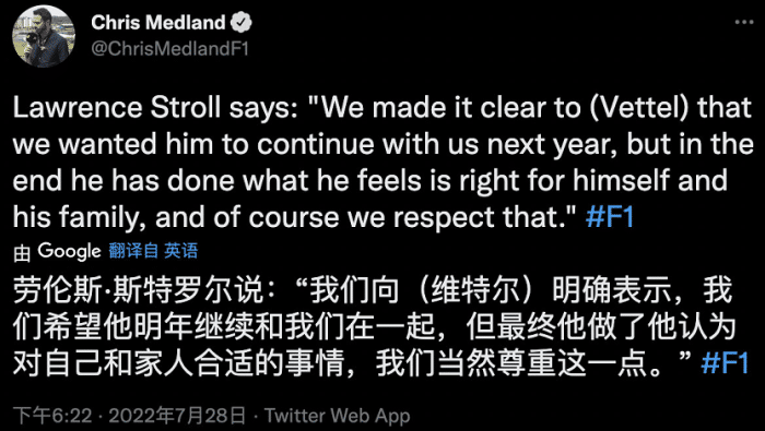 阿斯顿-马丁车队的老板劳伦斯-斯托尔在社交媒体上表达了对于维特尔的不舍和敬意,称:“我们明确地告诉维特尔,我们希望他明年继续和我们(阿斯顿·马丁车队)在一起,但最终他做了他认为对自己和他的家人最好的决定,我们尊重他的选择。”