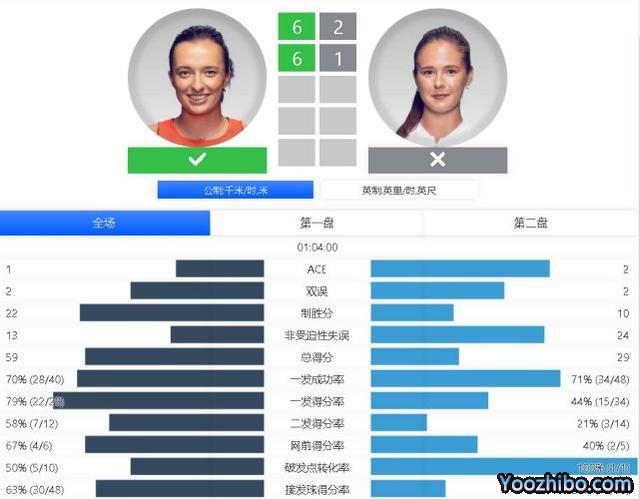 第二盘第4局比赛斯维亚泰克率先破发,取得3-1的领先优势。 第6局斯维亚泰克连下4分破发,5-1来到发球胜赛局。第7局斯维亚泰克轻松保发成功,6-1拿下了第二盘比赛的胜利。