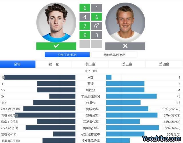 首盘鲁德在第2局和第4局两度破发,取得5-0的领先。第7局鲁德轻松保发成功,6-1赢下首盘。第二盘第5局和第6局双方互破发球局,第8局鲁德挽救破发点保发,第0局鲁内连下4分破掉鲁德发球局,6-4鲁内追回一盘。