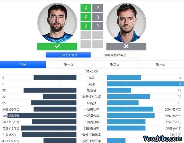 首盘,西里奇与梅德韦杰夫战至2-2,随后西里奇连续两次破发连续拿下最后的4局。