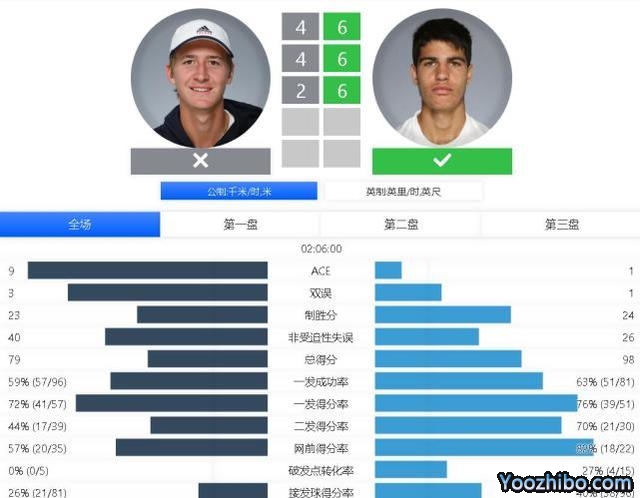 第二盘阿尔卡拉斯第4局挽救2个破发点顽强保发,第5局他率先完成破发,随后保发之后取得4-2的优势。第9局科达挽救5个盘末点保发成功,第10局阿尔卡拉斯顺利保下发球胜盘局,6-4再胜一盘。
